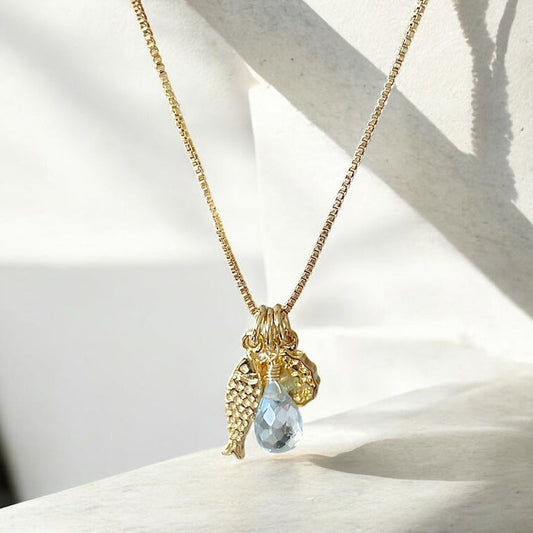 Collar trío aguamarina mini pez koi oro