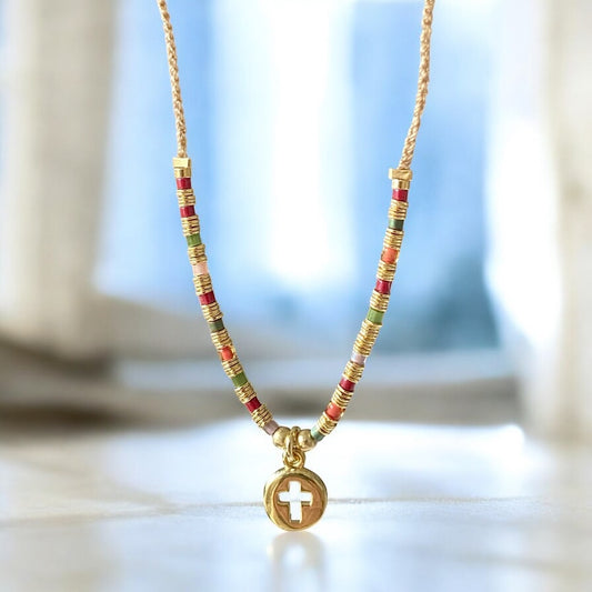 Collar tejido medalla cruz calada oro