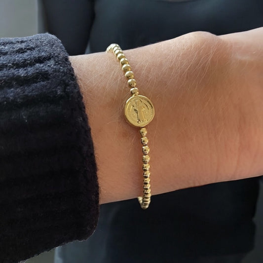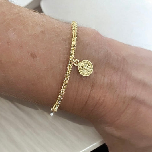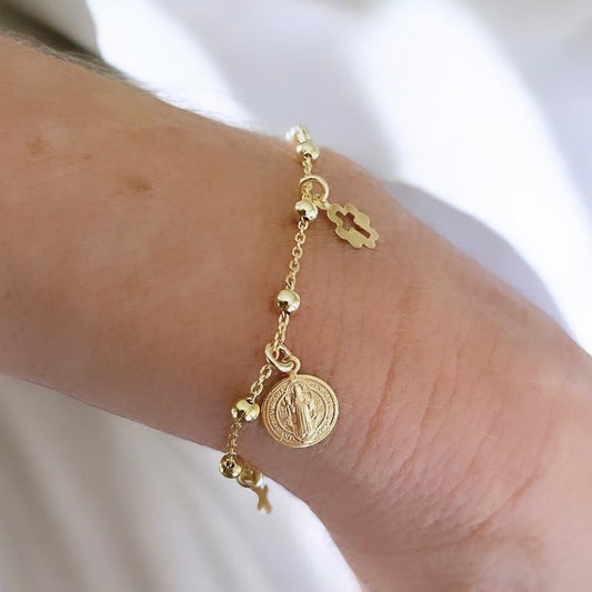 Pulsera bolitas medalla San Benito oro
