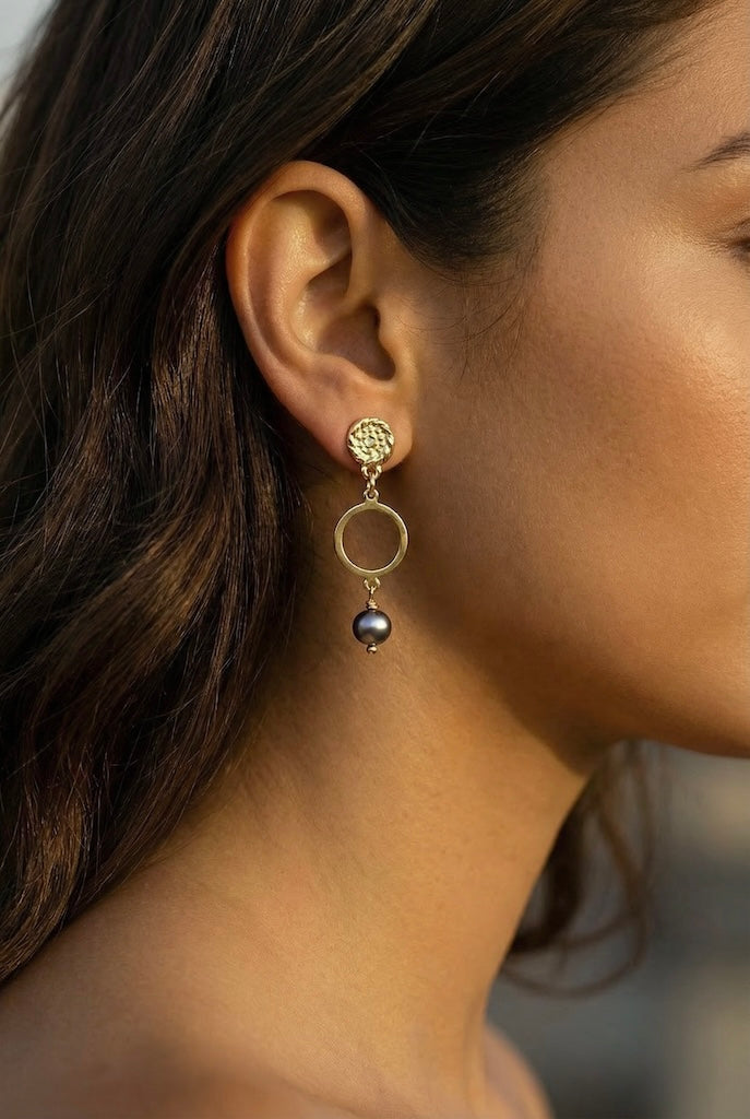 Aros círculo perla negra oro