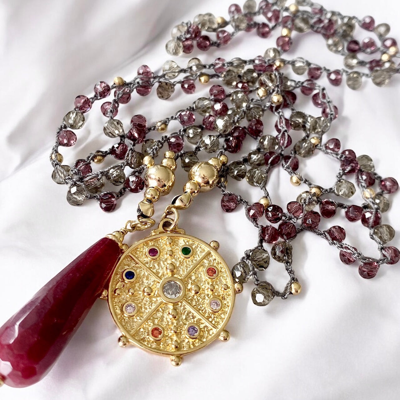 Colgante enchapado de 2,8 cm. de diámetro con circones de colores.