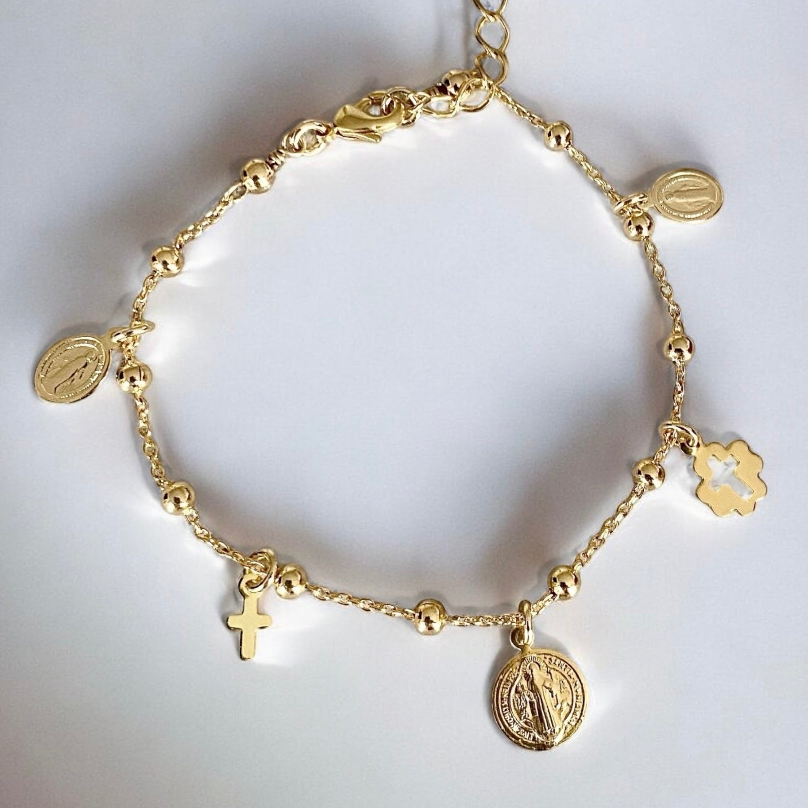 Medallas: San Benito, Virgen de los rayos, cruces.